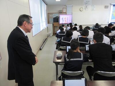 この授業を木城町教育委員会の恵利教育長も参観されました。「3年生が熱心に取り組んでいますね」とお褒めのことばをいただきました。