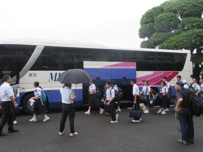 朝、6時15分に学校に集合し、出発式を行いました。みんな笑顔で,修学旅行を楽しみにしていたことが分かります。バスに乗り込む時は、小雨が降っていましたが,全員揃って宮崎空港へ出発しました。