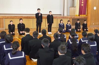 式では、転出される先生方からお一人お一人言葉をいただいた後、代表で2年生の中武さんがお礼の言葉を述べました。花束贈呈の後、校歌を全員で歌いました。