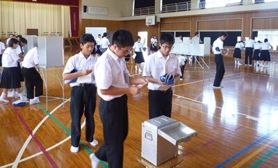 今日、選挙権が18歳になったことを受け、選挙の仕組みや一票の大切さ等について、高校生に向けての主権者教育が求められていますが、中学校においても、生徒会選挙等を中心に、意識を高めていきたいと考えています。