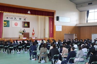 本日は、第74回入学式でした。新型コロナウィルス対策で2・3年生は式に参加せず、来賓も3名のみの式でした。また、マスク着用や椅子の間隔を広く取るなど例年とは違う状況の中での入学式でしたが、新入生はしっかりした態度で式に臨んでくれました。明日からの中学校生活が楽しみな入学式となりました。