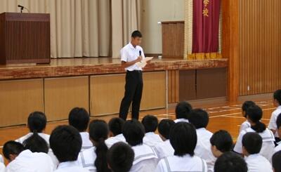 大勢の小学生の前での発表には、やや緊張気味の部分もありましたが、中学生のお兄さん、お姉さんからのメッセージをしっかり伝えることができたと思います。