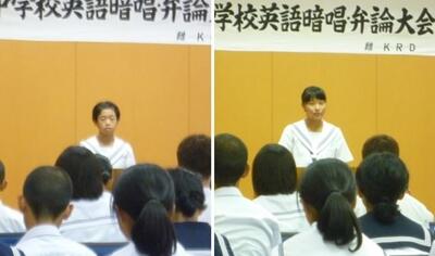 午後の弁論の部では、2年生の濱砂さん(写真左)と3年生の鈴木さん(写真右)が、それぞれの思いを英語で話してくれました。