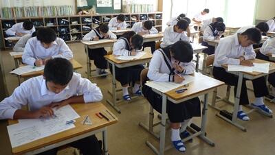 2学期になって、体育大会や文化祭などの行事面や、中体連大会でがんばってきた生徒たちですが、学生の本分はやっぱり勉強です。写真は2時間目の様子です。上から1年生は英語、2年生は数学、3年生は理科のテストです。3年生は2週続けてのテストですね。