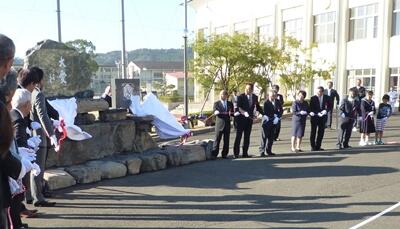 式典に先だって、文学碑「大愛」の除幕式が行われ、これには1年生の倉掛さんが、代表で参加しました。(写真右から2番目です)