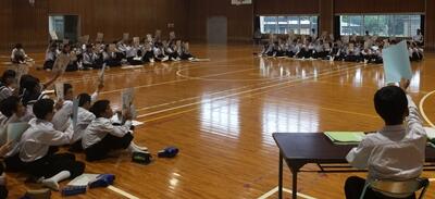 全校集会では、校長の話の後に、保健体育委員会から、熱中症の予防と対応について話がありました。プレゼンを使ってとても分かりやすく説明してくれました。