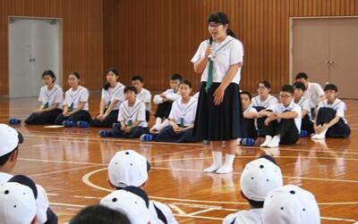 まず最初に、JRC委員長の大山君が、JRCについて説明してくれました。県内では約4万人の生徒が加盟し、東児湯地区の中学校では、木城中と国光原中が加盟していることなどについても教えてくれました。