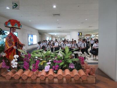 宮崎空港では,飛行機のチケットを受け取り、搭乗手続きをして出発ロビーへ入りました。飛行機は、予定通り沖縄に向かって飛び立ちましたが、沖縄は大雨のため空港が混雑ししており、少し遅れて那覇空港に到着しました。那覇空港では沖縄の民族衣装を着た人形と美しい花々が出迎えてくれました。