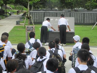 その後、平和記念公園に向かいました。バスガイドさんから、戦争で亡くなった方々の名前が刻まれた石碑の説明を聞きました。平和公園では、「平和の集い」を行い,みんなで折った折り鶴を捧げました。心配された雨も上がり,出発する頃には、青空がのぞいていました。