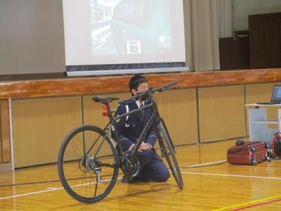 高鍋警察署から講師をお招きし、交通ルールや自転車の点検の仕方等、具体的に指導をしていただきました。