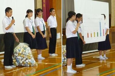 次に生徒会執行部から、アルミ缶やペットボトルキャップの回収にについての報告がありました。ご家庭でのご協力、ありがとうございました。