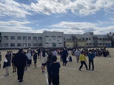 校舎と全校生徒を一緒に撮影するために、小学校の校庭に全校生徒で人文字をつくり、上空からドローンで撮影してもらいました。