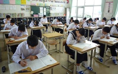 2学期になって、体育大会や文化祭などの行事面や、中体連大会でがんばってきた生徒たちですが、学生の本分はやっぱり勉強です。写真は2時間目の様子です。上から1年生は英語、2年生は数学、3年生は理科のテストです。3年生は2週続けてのテストですね。