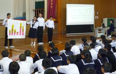 次に、新執行部から、あいさつ運動についての反省や呼びかけがありました。また、JRC委員会から、ペットボトルキャップ回収の状況報告(写真)や、10月の「いい日(11日)」の2A・2Bの取組についての紹介がありました。