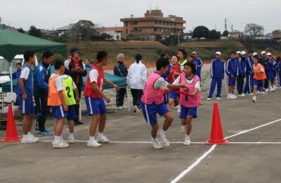 最初に駅伝の部を行いました。1・3・5区を女子、2・4・6区を男子が走ります。写真は1区から2区への中継の様子です。2B、3B、1B、1Aが接戦です。