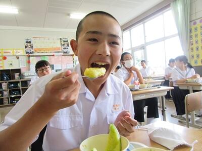 本日の給食に児湯地区で育てられたメロンが出ました。これはおいしいメロンを木城中の生徒たちに食べてもらおうと宮崎県よりいただいたものです。給食には様々なメニューが出ますが、メロンはあまり出たことがありません。生徒たちも喜んで食べていました。とってもおいしかったです。