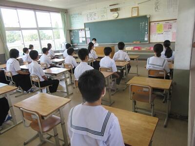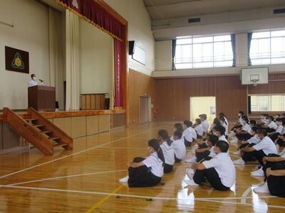 生徒は、通常通り登校し、全校集会と学活(課題点検等)を行いました。全校集会は、コロナウィルス対策で放送で行いました。校長先生の話に続き、保体給食委員会の委員長・副委員長が熱中症対策について指導してくれました。続いて、学級設営コンクールの結果が発表されました。みんなしっかりと放送に耳を傾けていました。