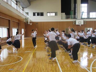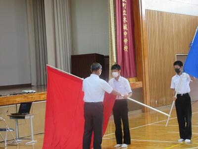 はじめに体育大会実行委員が一人一人あいつを行い、その後、校長から両団長へ団旗が渡されました。続いて両団に分かれての決意表明ですが、今年はコロナ対策で大声を出せず、各団とも拍手や動きで決意を表現していました。体育大会は今年は10月11日(日)です。みんなで、今できることを考えながら準備していきます。