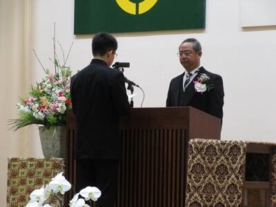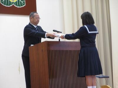 まず、生徒代表3名が反省を述べてくれました。1年間の成長を感じさせる立派な発表でした。続いて1・2年生の代表者に修了証を渡しました。