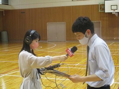 生徒が歌う校歌の収録や学校自慢、行事等についてのインタビューがあり、生徒会のメンバーが答えてくれました。