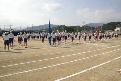 義務教育学校開校に係る新校舎建設に伴い、現在のグラウンドで行う最後の体育大会となります。暑い中生徒は集中し協力しながら練習に取り組んでいます。7日は総予行練習が行われました。当日が楽しみです。なお、体育大会は14日(火)に予定しています。