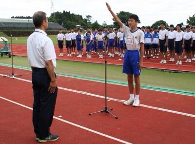 開会式の選手宣誓では、本校陸上部主将の田原君が力強い宣誓を行いました。