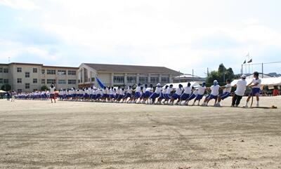 全校団技の綱引き。人数調整のために、半渡町長が青団に加わってくださいました。お互いに1勝をあげ、決勝では僅差で青団が勝ちました。
