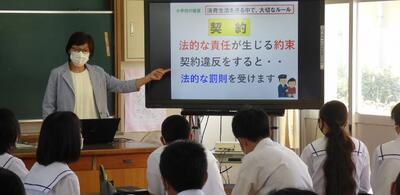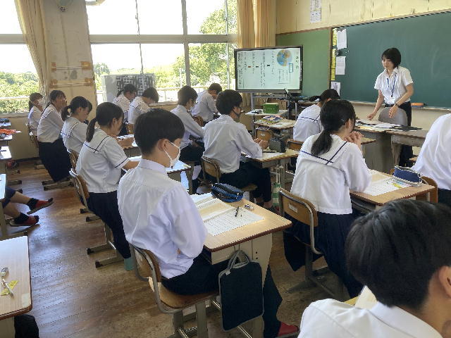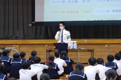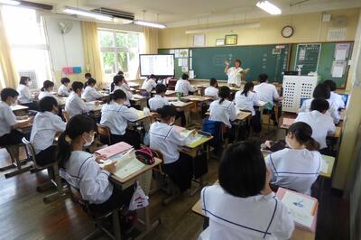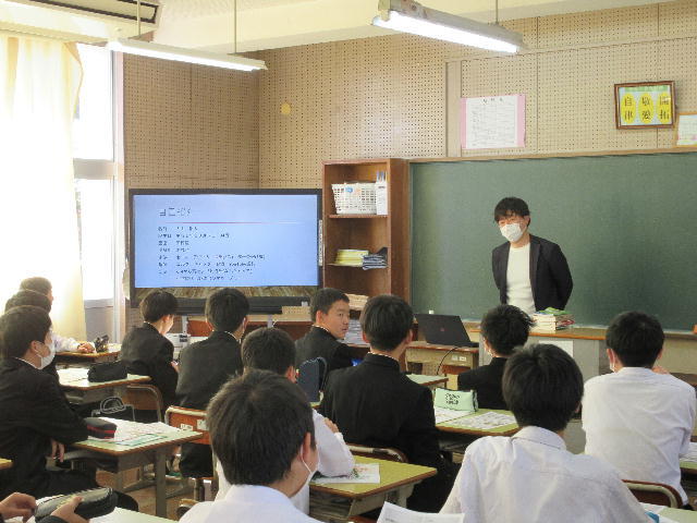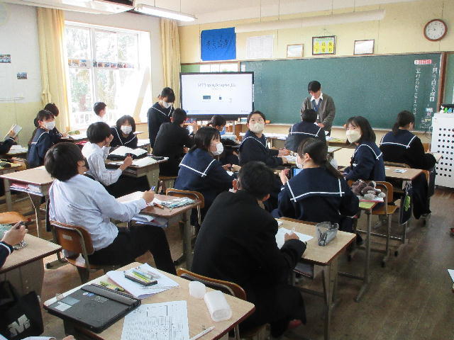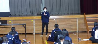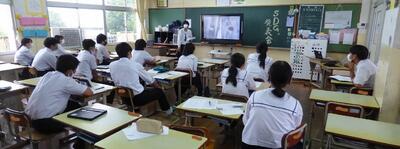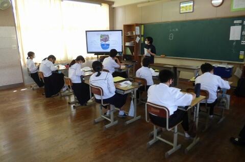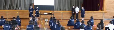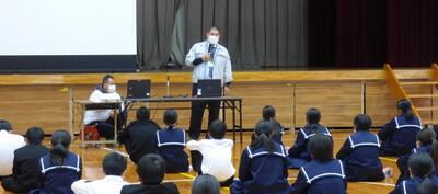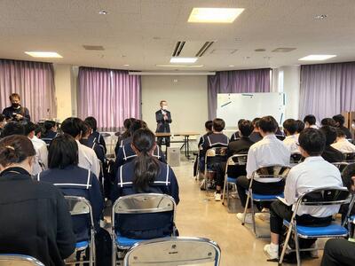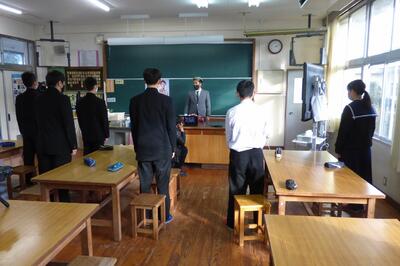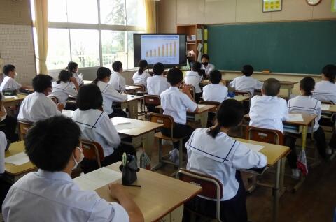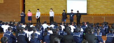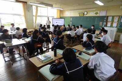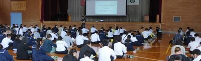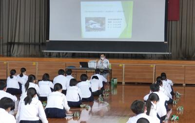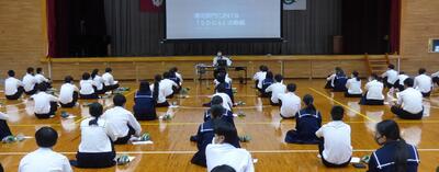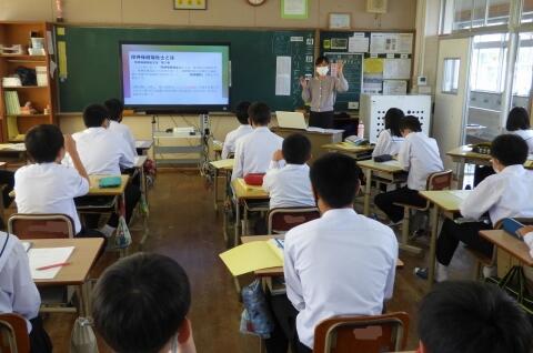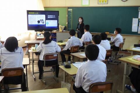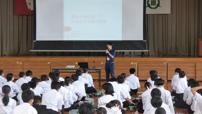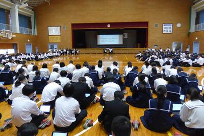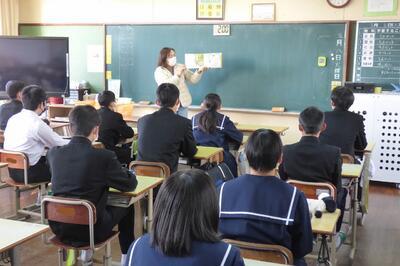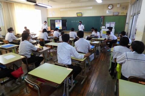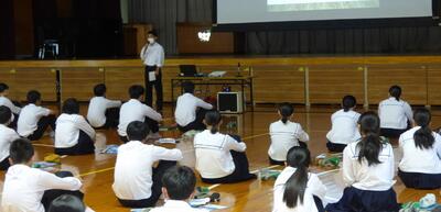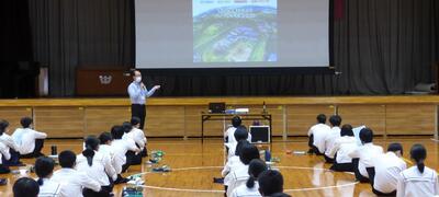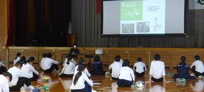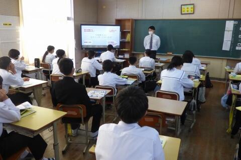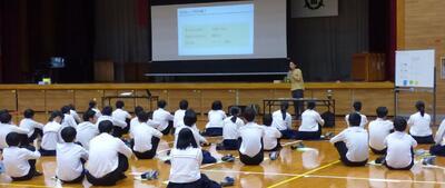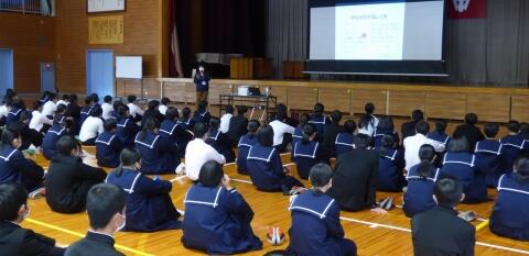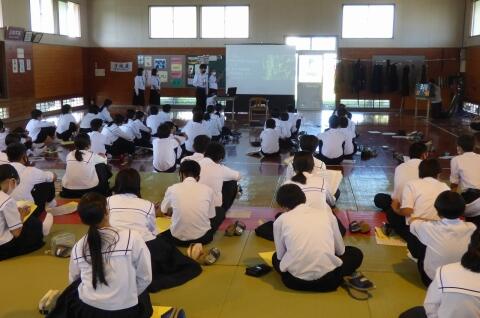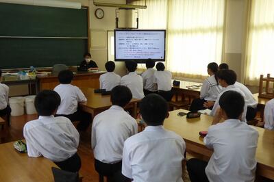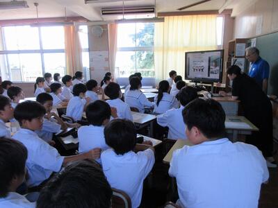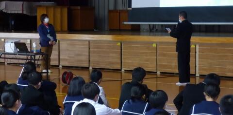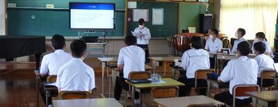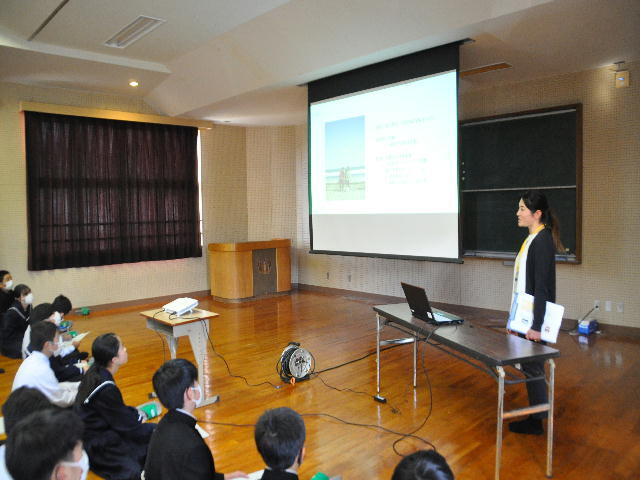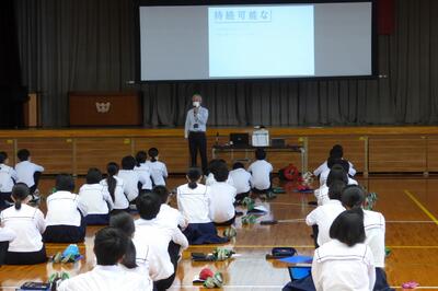 町役場総務課の方に講師を務めていただき、SDGsの理念や川南町の取組等について分かりやすく説明をしていただきました。今回の講話の中には、皆さんがこれからの社会や生き方について考えていく上でとても貴重な内容が含まれていたと思います。これからの学習に生かしていってください。
