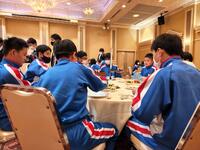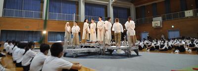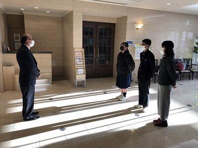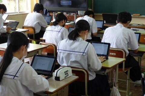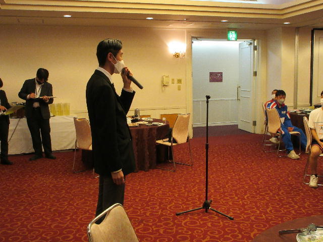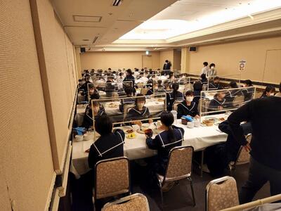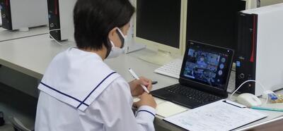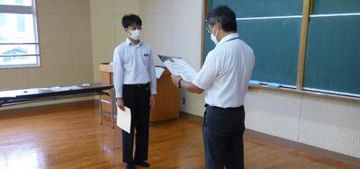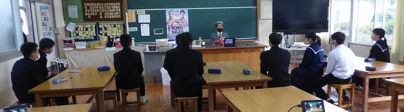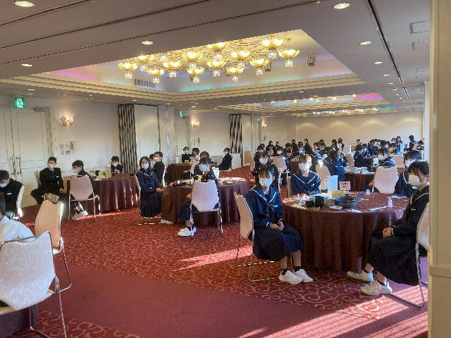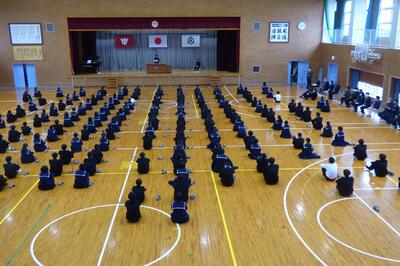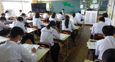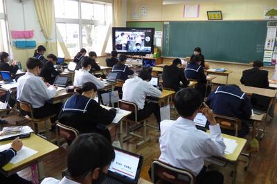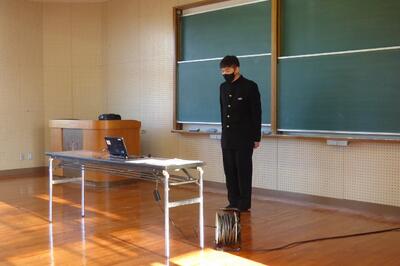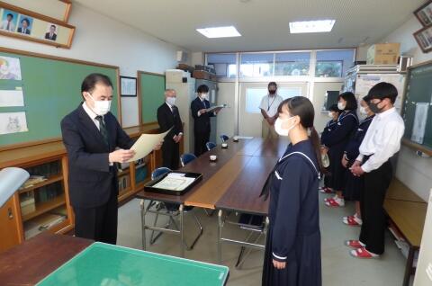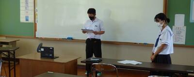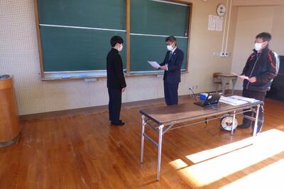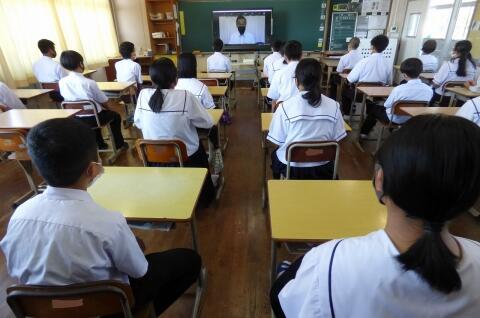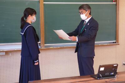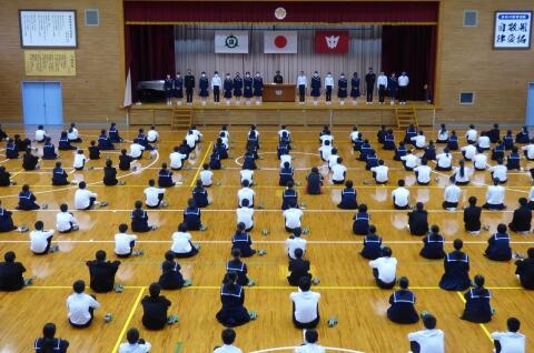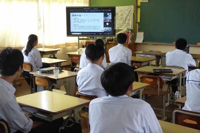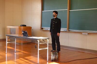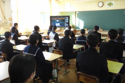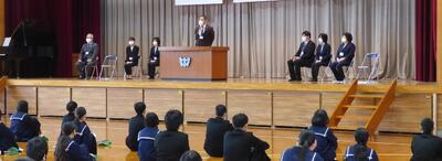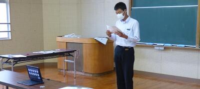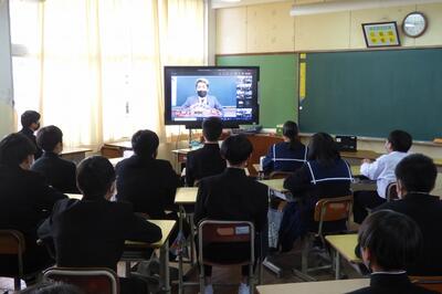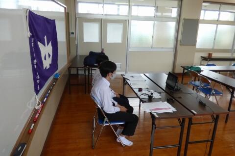 選手を全生徒で激励するという式なので、本来ならば体育館に一堂に会して実施したかったのですが、コロナ感染予防対策のため、リモートで実施しました。会議室でタブレット端末を利用して行いましたが、各学級から大きな拍手が聞こえてきて、全校生徒みんなが選手を応援しようという気持ちになってくれていたのではないかと感じました。