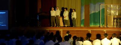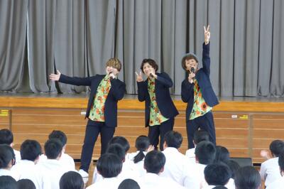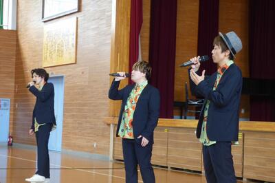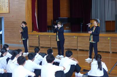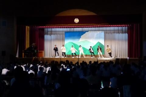公演では、じゃーんずΩのオリジナル曲やカバー曲を素晴らしいコーラスで聴かせてくださいました。特にドラムやベースの音を、本物の楽器のように肉声で再現していることにはとても驚かされました。公演中はボイスパーカッションの講習をしてくださるなど、終始楽しい雰囲気でした。また、アンコール曲「笑ってしまえ」では、全校生徒の半数近くが前に出て踊るほどの大盛り上がりで、飽きることなくあっという間に時間が過ぎていきました。