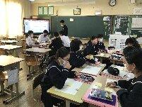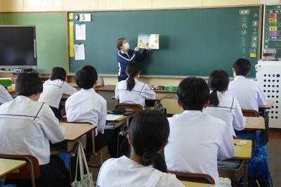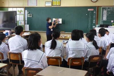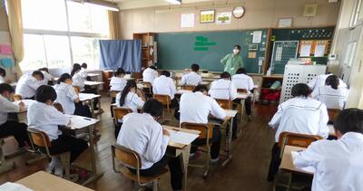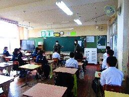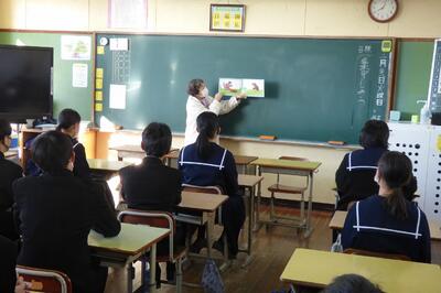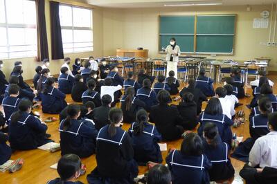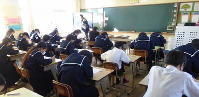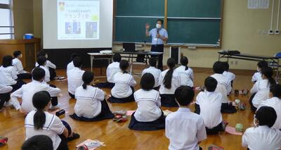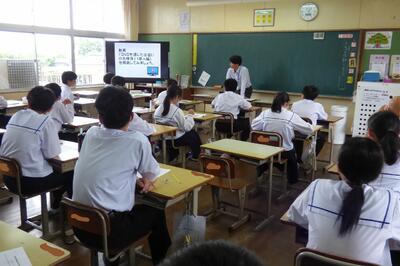 本日、1年生を対象に、ふるさと学習の一環として、町商工会と町教育課の方に講話をしていただきました。川南町の軽トラ市、神社、仏閣等について、それぞれ専門的な立場から話をしていただき、ふるさと川南について理解を深めることができました。