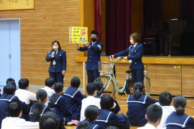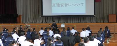 本校において交通安全の徹底は毎年の重点課題の一つです。交通ルールを守る、日々自転車の安全点検を行って交通事故の発生を防ぐ、自転車の施錠を確実に行う、このようなことを意識して自転車を安全に利用してほしいと思います。交通安全の徹底はいつ、どこでも、必ず求められることです。みんなで安全な毎日をつくっていきましょう。