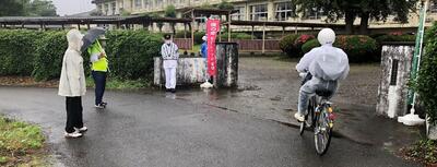 本日の朝はあいにくの雨でしたが、本校で川南交番の方や交通指導員等の方々が自転車マナーアップキャンペーンを実施しました。声かけ運動や自転車の施錠点検等を行っていただきました。