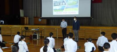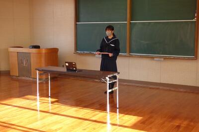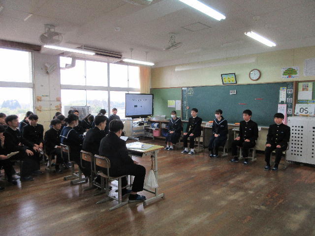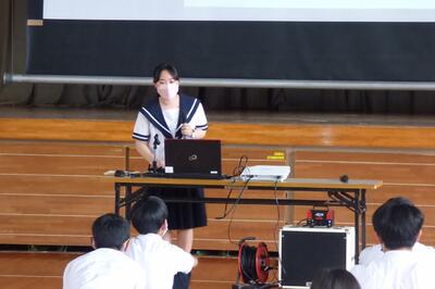 また、卒業生の話を聞く会では、高鍋高等学校探究科学科の生徒2名がこれまで取り組んだ研究内容を発表してくれました。発表してくれた内容も大変素晴らしかったですが、発表している時の堂々とした態度に大変感銘を受けました。今回、高校生の姿を見て、3年生の皆さんはどのようなことを考え、感じたでしょうか。これからの探究活動や進路学習に生かしていきましょう。