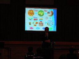 講演のねらいは「心身の成長や健康の保持増進の上で、成長期に必要な望ましい栄養や食事のとり方など、食に関する正しい知識の習得を目指すとともに、自分の食生活に関心を持ち、よりよい食習慣について考えさせる。」です。
