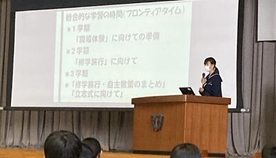 今回はコロナ感染予防のため、生徒会執行部及び専門委員会の生徒が新入生に生徒会活動や部活動について説明する方式で実施しました。