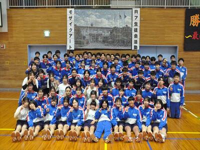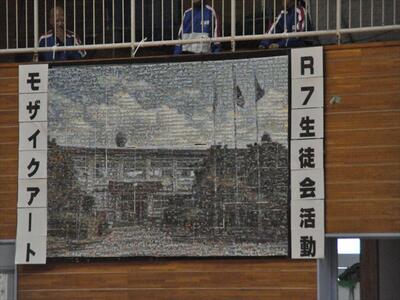 体育館壁面には、あいさつ運動を行うごとに配付された写真をもとに構成されたモザイクアートとして本校校舎を映し出すことができました。近距離ではイメージしにくかったのですが、離れて眺めると壮大なアートだと実感させられました。