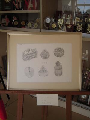 玄関には、美術部の皆さんが絵画を展示しています。今週からはこの絵画です。この作品名は、「いろんなケーキ」です。