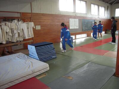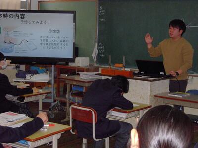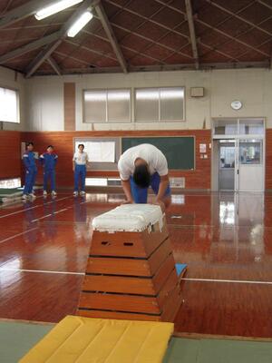保健体育の授業では、跳び箱での台上前転をしています。高さがあることと、台から転倒するのではないかという2つの恐怖心との戦いです。