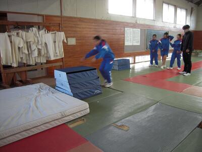 この跳び箱は、台が柔らかく、高さも低いため恐怖心がなく、飛びやすいものです。生徒の様子に応じて台の高さ、形状が変わります。