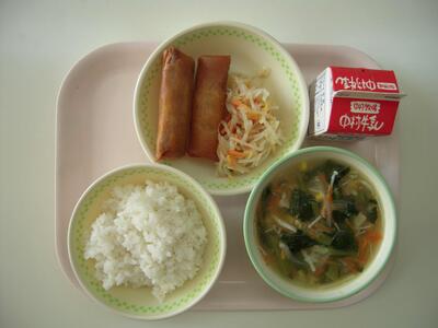 今日の給食献立は、「ちゅうかコーンスープ」「あげはるまき」「もやしのレモンあえ」「ご飯」「牛乳」です。