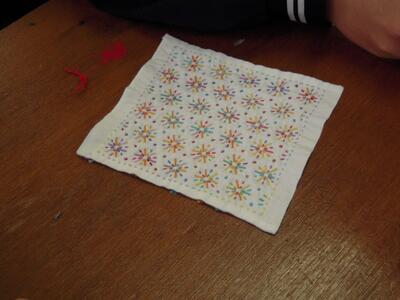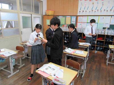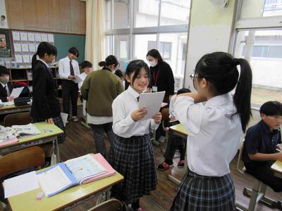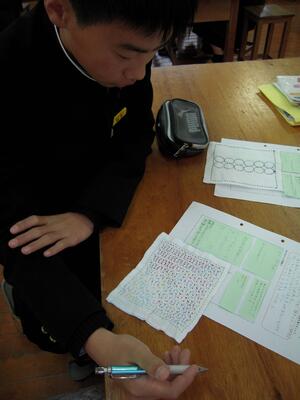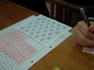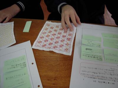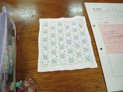 2年生は、家庭科で刺し子に取り組んでいました。その刺し子の学習も今日が最終日です。それぞれの作品にコメントを付けています。学級の友達が作った作品をじっくり見て、思ったことを縷々と書いています。