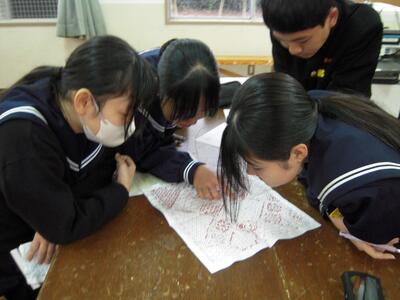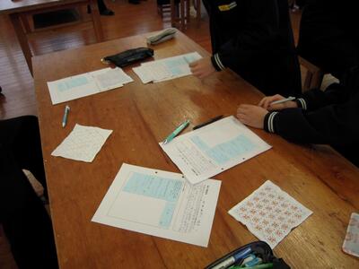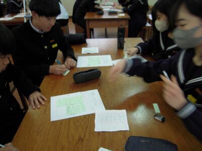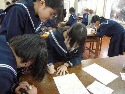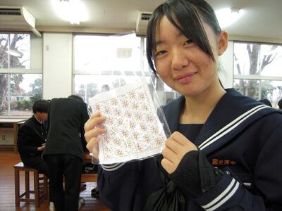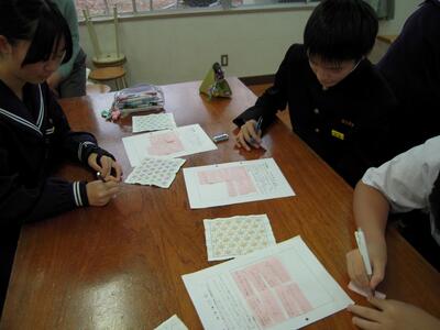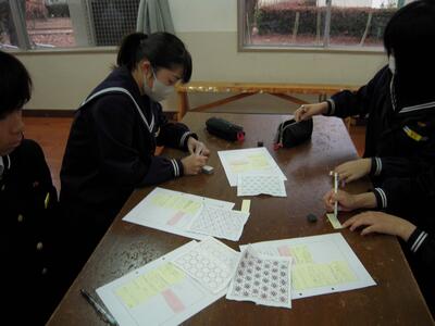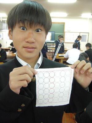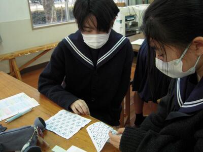 今日の授業の様子です。2年生家庭科、刺し子です。約3か月刺し子を制作してきましたが、いよいよこの時間が最後となりました。できあがった友達の作品にコメントを書き込んでいます。