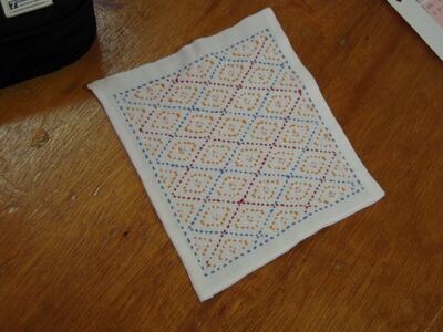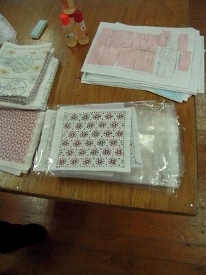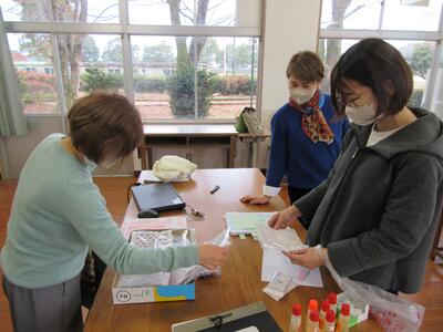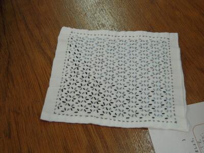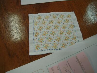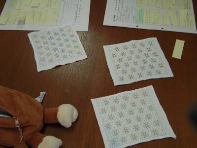 刺し子を始めた1時間目に来校いただいた2名の先生が、どんな作品ができたのか?見に来られました。
