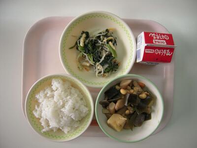 今日の給食献立は、「ごもくに」「ちぐさあえ」「ご飯」「牛乳」です。