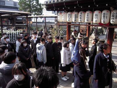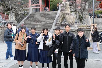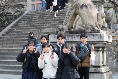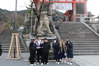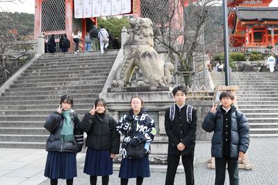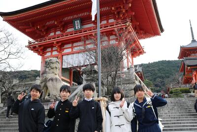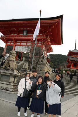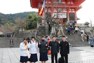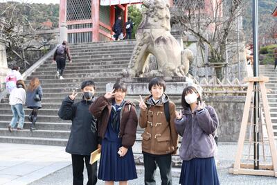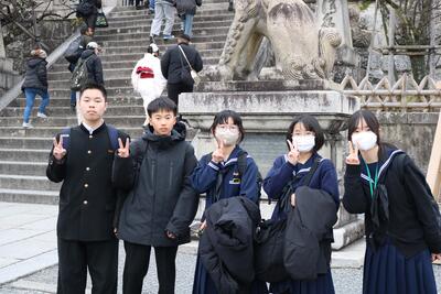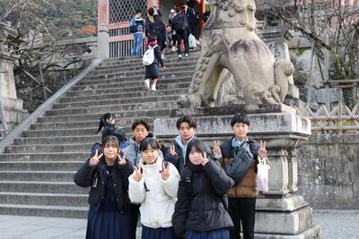 班別自主研修の一日でした。清水寺はチェックポイントとなっているため、予め班ごとに決めた時刻にやって来ました。ポーズや防寒着は様々ですが、とても素敵な笑顔が溢れています。