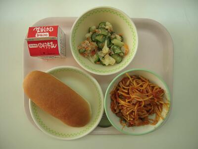 今日の給食献立は、「スパゲティナポリタン」「カリフラワーのサラダ」「コッペパン」「牛乳」です。