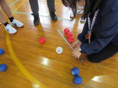 まず、講師の紹介、そしてボッチャのルール説明がありました。ジャックボールと呼ばれる白いボール(目標球)を投げた後、対戦する両者がそれぞれ赤と青の6球を投げ合い、自球をよりジャックに近づけたチームまたは個人が勝者となります。