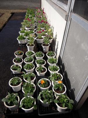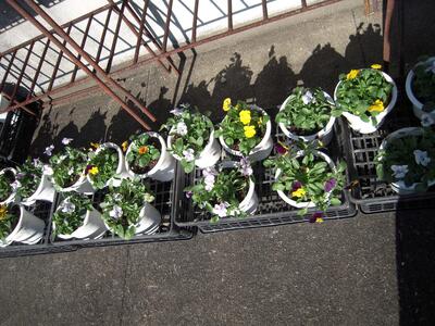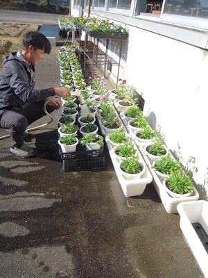 卒業式、入学式の会場を彩る「お花」250鉢が先週、届きました。そのお花を少し大きめの鉢に移植します。