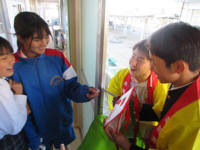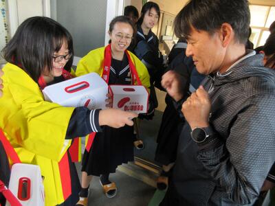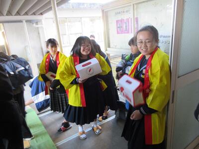 この「赤い羽根共同募金運動」に取り組みたい。と手をあげた生徒会執行部の皆さんでした。昨日は、募金活動に取り組みました。せっかく取り組むのだったら・・・ということで「法被」を着ると、モチベーションがあがりました。